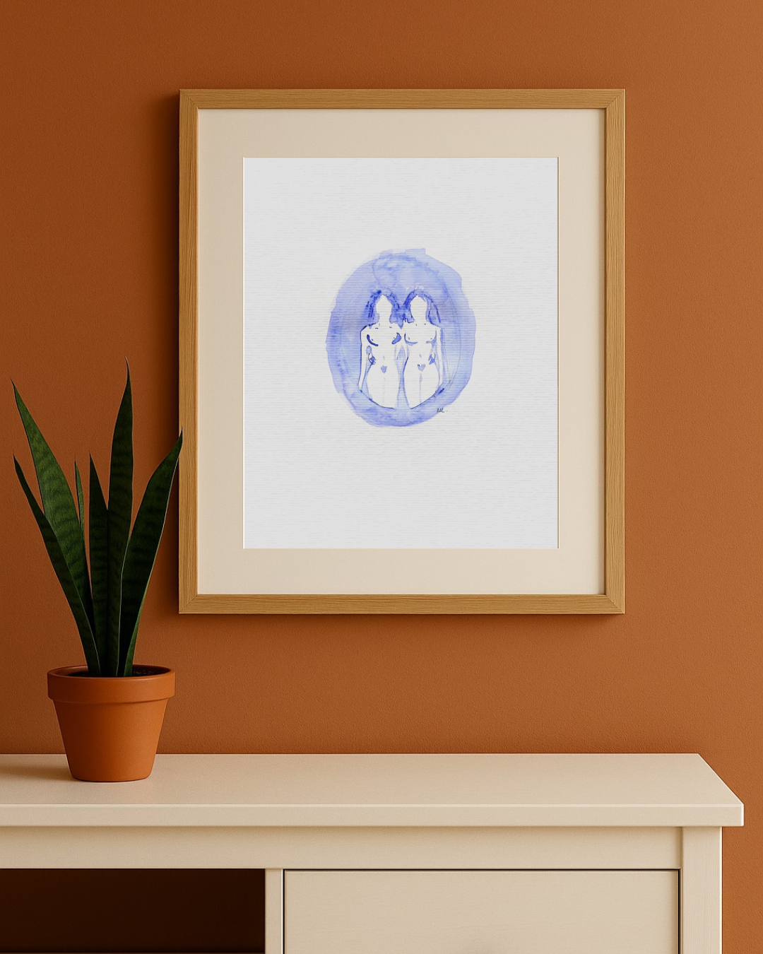 Lámina, originalmente creada en acuarela, de dos mujeres abrazadas, en color azul sobre fondo blanco.