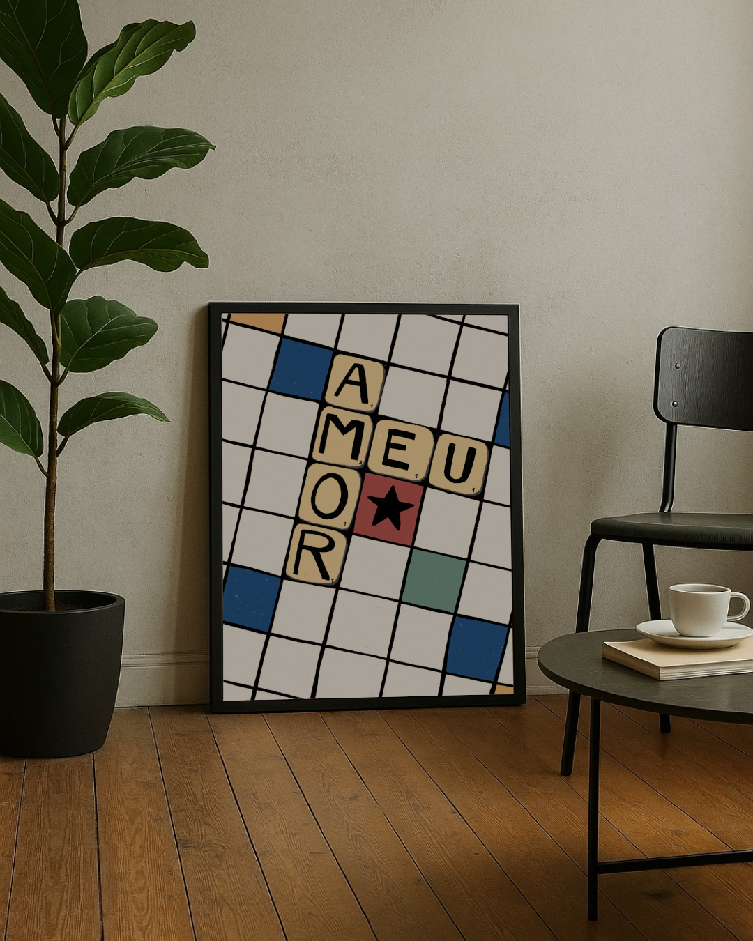 Lámina de un tablero de Scrabble con fichas con el texto "Amor mío", en tonos beige, azul, verde, rojo y amarillo.
