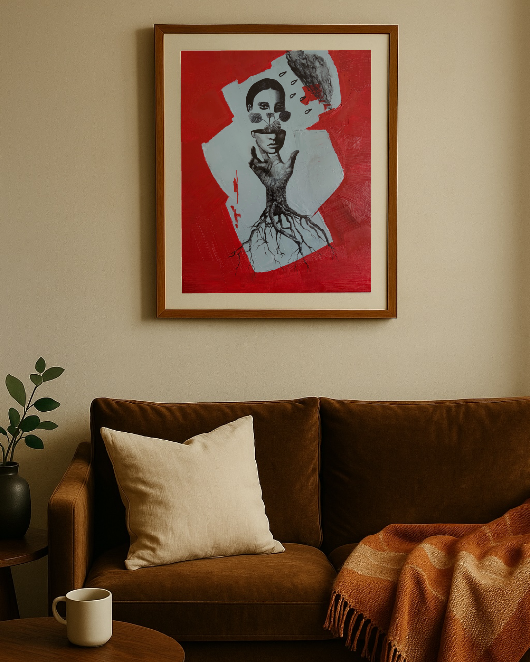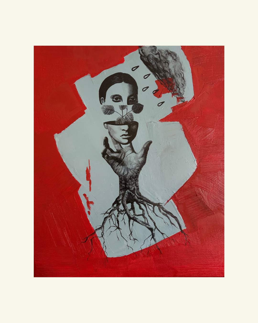 Reproducción de pintura al óleo de una mujer que emerge de una mano con raíces de árbol. En la imagen destaca el color rojo del fondo y el gris y blanco de la imagen. Obra de la artista Alex Scalbert.