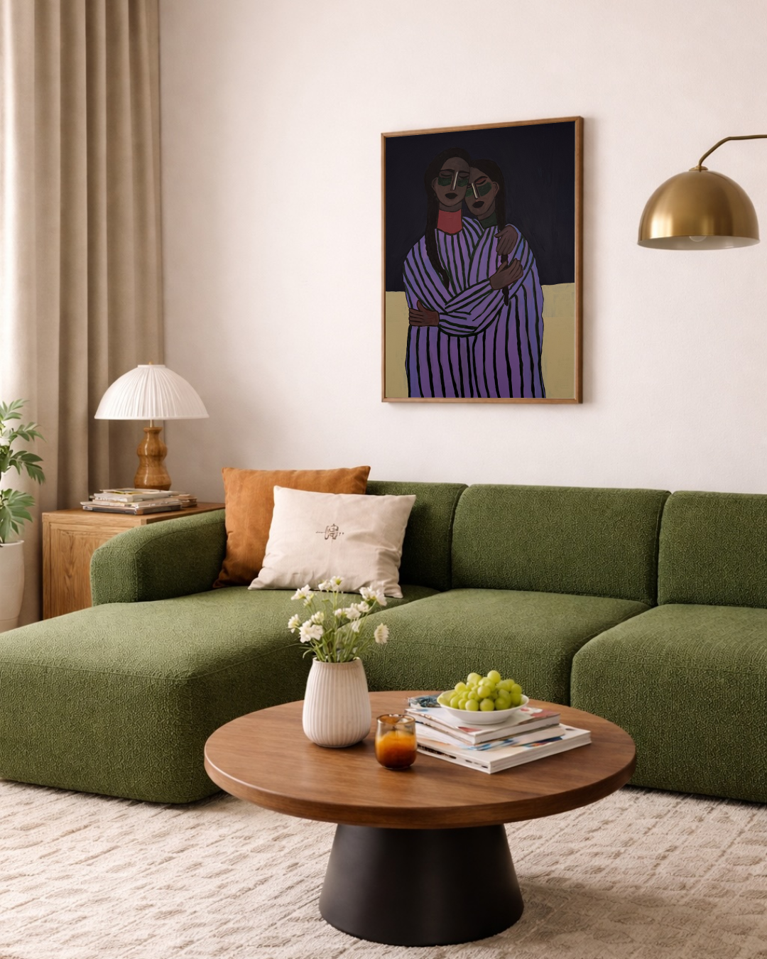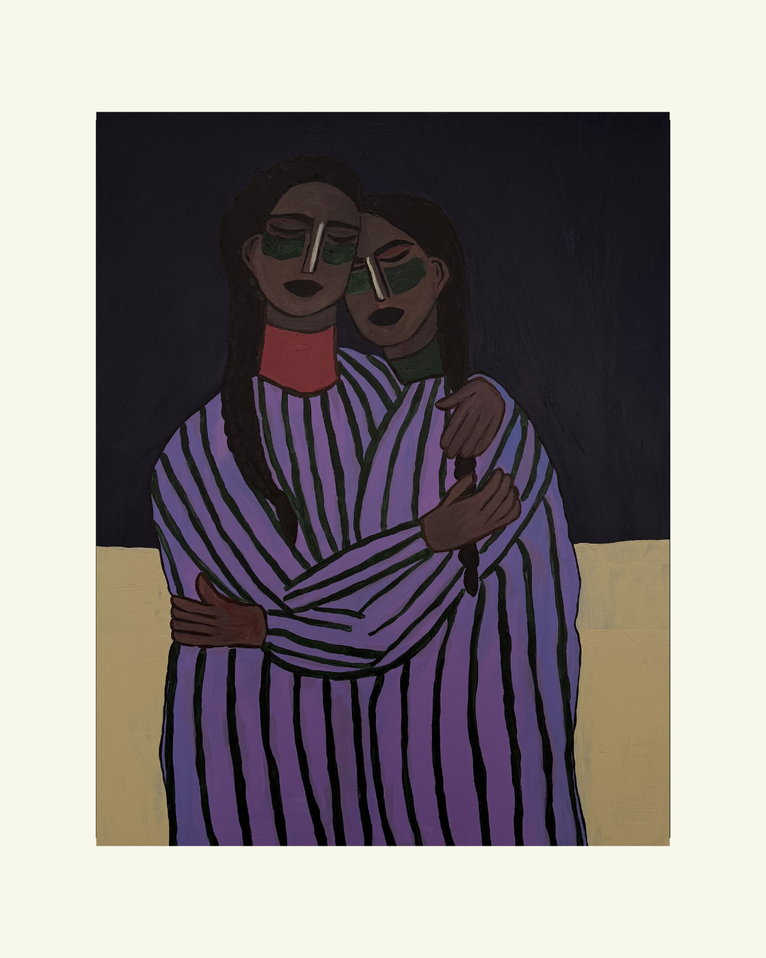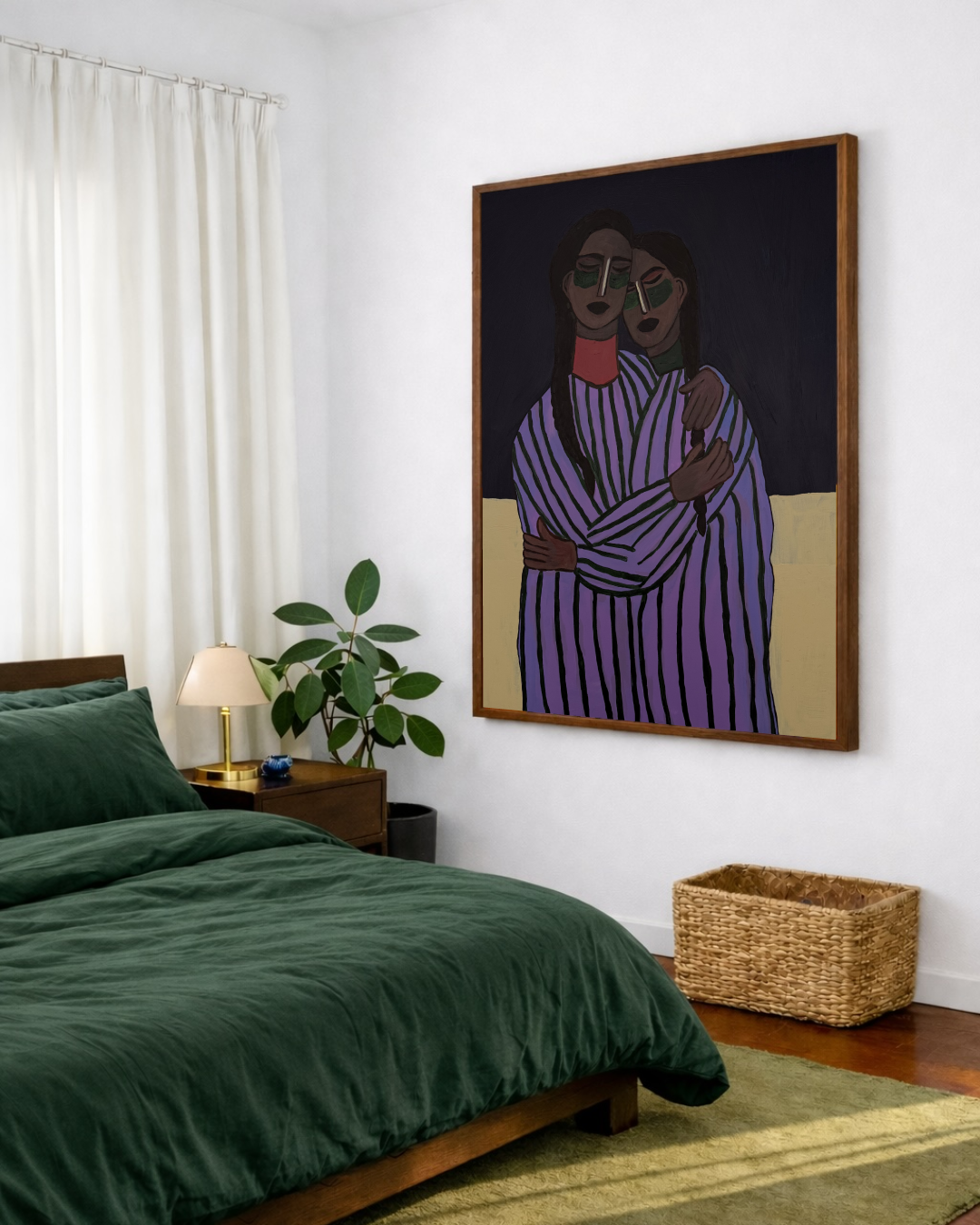 Reproducción de una pintura al óleo de dos mujeres abrazadas, con vestidos en tonos violeta, y fondo azul y amarillo.