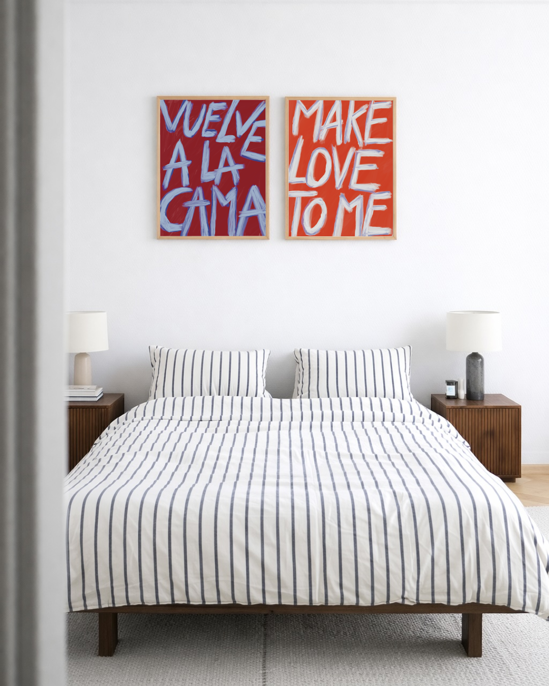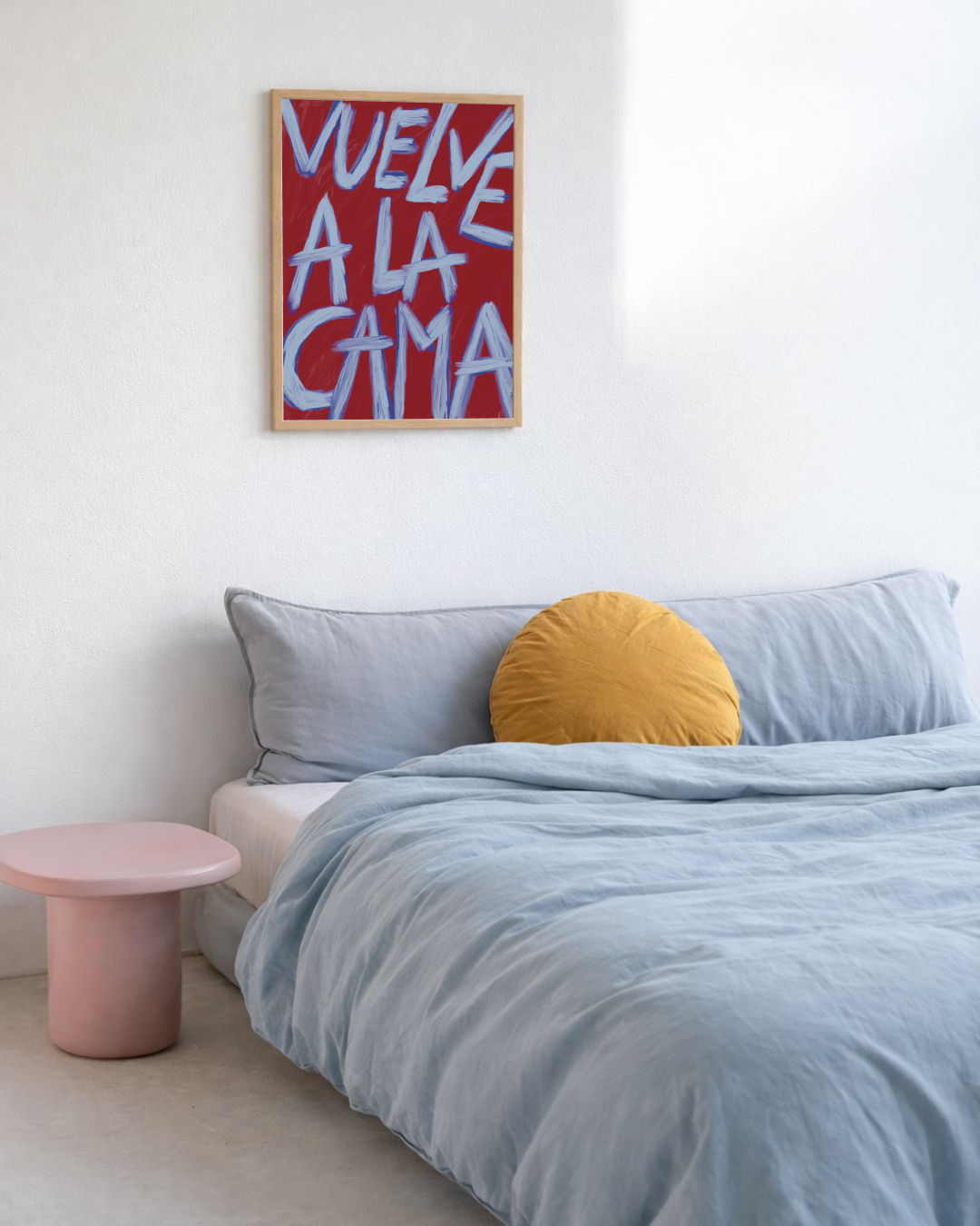 Póster con el texto "Vuelve a la cama", en azul y blanco sobre rojo.